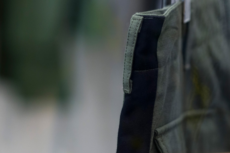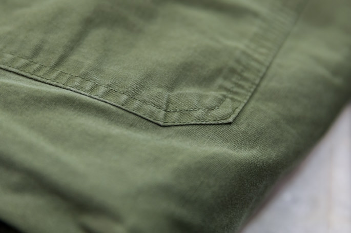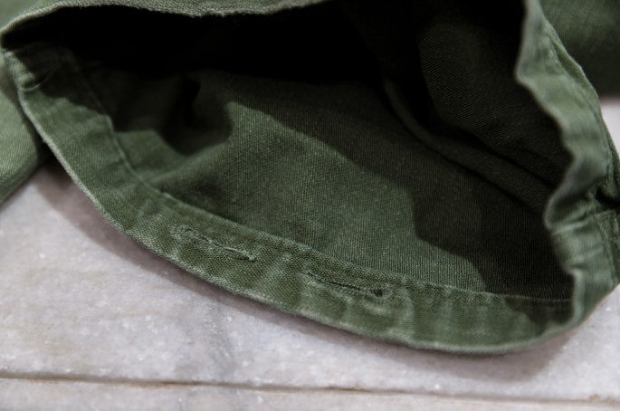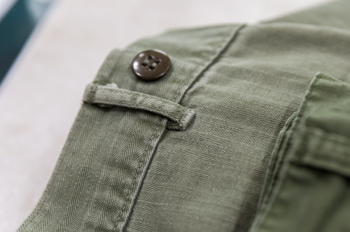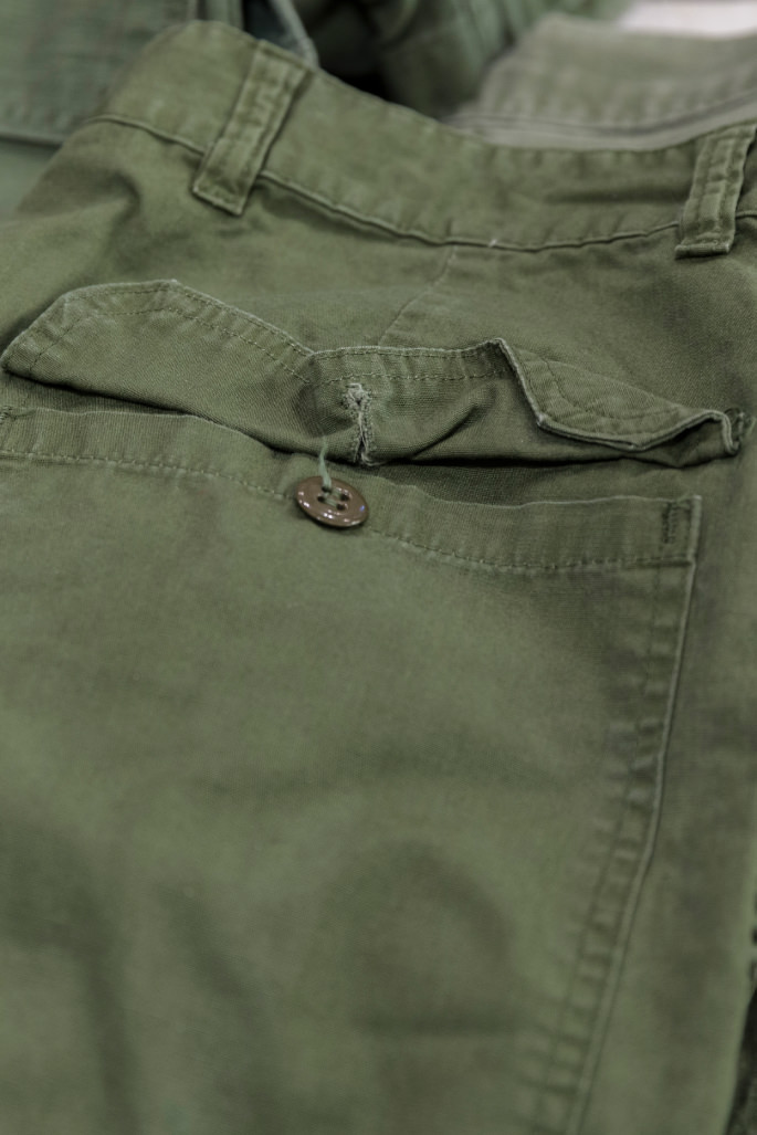 Fatigue pants are typically made with a single fabric with a button fly front, front patch pockets on both sides, a back patch pocket and a back flap pocket. Unlike other types of military pants, all the pockets of fatigue pants are patched on. I think it’s because the durable yet easy-to-make design helped improve productivity. While six-pocket pants were made for field battles, these four-pocket ones were designed to be worn for various activities such as work, training and factory labor. Fatigue pants were, therefore, designed very simple to be supplied to a vast number of soldiers. Another reason of the solid design was just because it was made earlier than other types of pants, I guess.