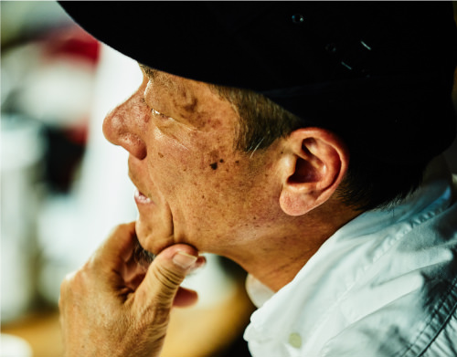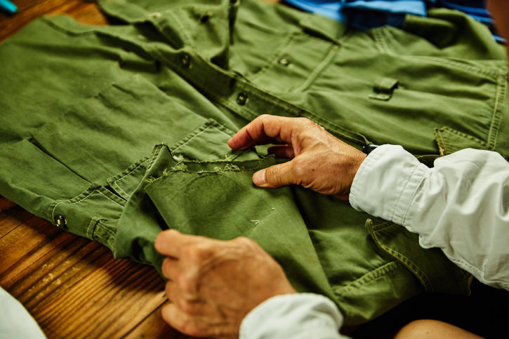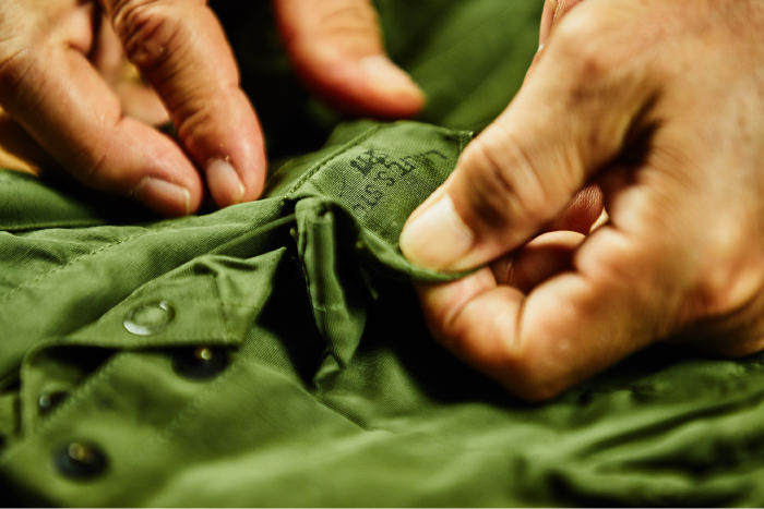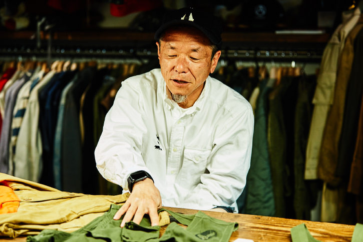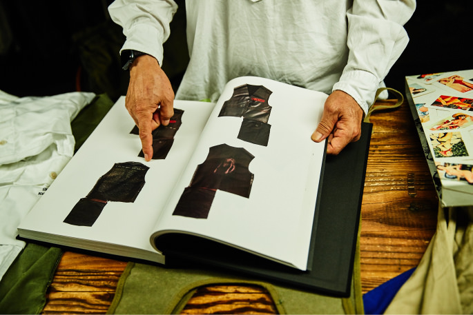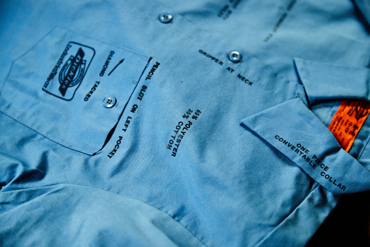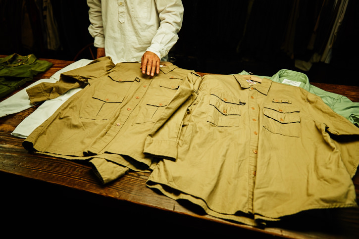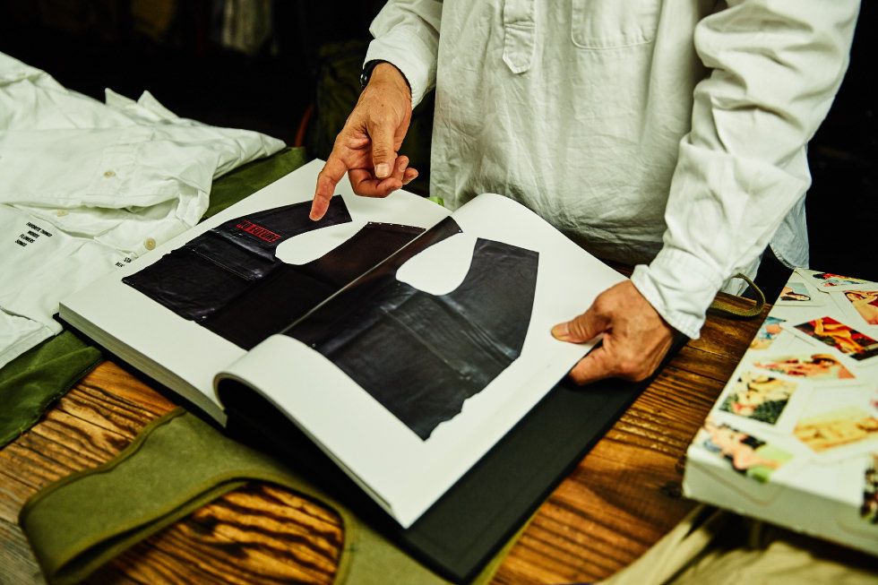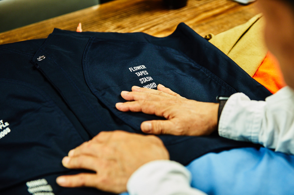 The original inspiration of the design came from the stencils on C-1 vests. Making a garment with the detail not for battlefields means that we can freely decide what each pocket should contain, doesn’t it? Designers usually express their messages through their designs, but this detail gives me one more fussy way of expression. I enjoy annoying people by whispering “wouldn’t it be nice if you put a flower here?” or “How about stowing your lip balm in this pocket?” with the prints (laughs). I even picked a word used in a song by the Grateful Dead. The design also conveys my thoughts that a pocket should contain various things. The shape of each pocket is made by referring and converting my favorite designs. Another inspiration of my design is salesman’s samples. American salesmen used to use them to learn about their products. This shirt, for example, has selling points printed on the body. The detail intrigues me, too.