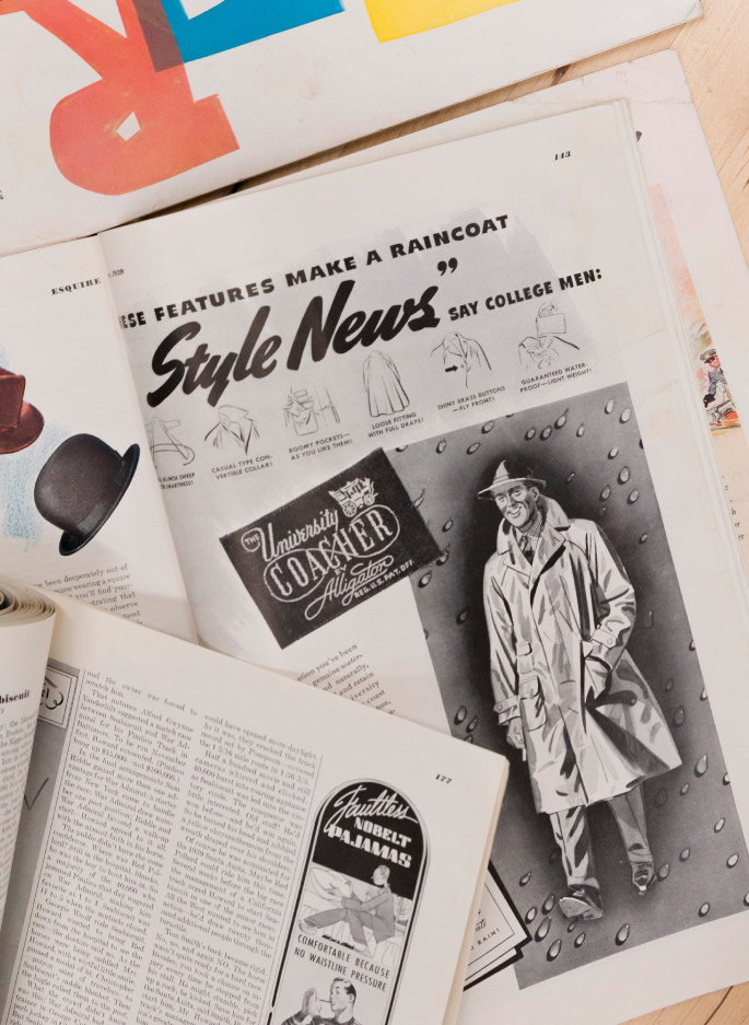 “The coat became even more popular in the1950s as some American manufacturers made the made-to-order piece available with volume production and affordable for everyone. Balmacaans then came to be featured more frequently and vividly on magazines and catalogs. The manufacturers launched new functional materials for the garment one after the other, aggressively calling attention to their newly developed products featuring ‘an excellent waterproof property,’ ‘quality gabardine’ or ‘exclusive fabric,’ as if to compete with a famous English fabric, Ventile. Balmacaan coats were then introduced to Japan in the 1960s as one of the staples of Ivy League students, and smart young people of the time spread it across the nation. After products made by BURBERRY, one of the representative manufacturers of the coat, came to be officially imported to Japan in 1965 and their licensed products also began to be sold in 1970, balmacaans became even more widely known in the country. Looking at the back issues of Men’s Club magazine from the 1970s, I can find articles featuring the garment in almost every issue.”