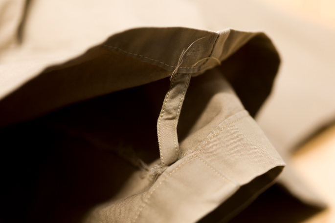 This balmacaan made probably in the 1950s by AQUATOGS is from Kojima’s personal collection. It is rare to use the same fabric for the lining as the exterior like this piece. The outer fabric and the lining are not firmly attached together, but connected each other with fabric tapes to prevent fabric shrinkage and the coat from getting out of shape. Such a detail shows the fact that the garment was originally made as a highly elaborate piece of clothes.