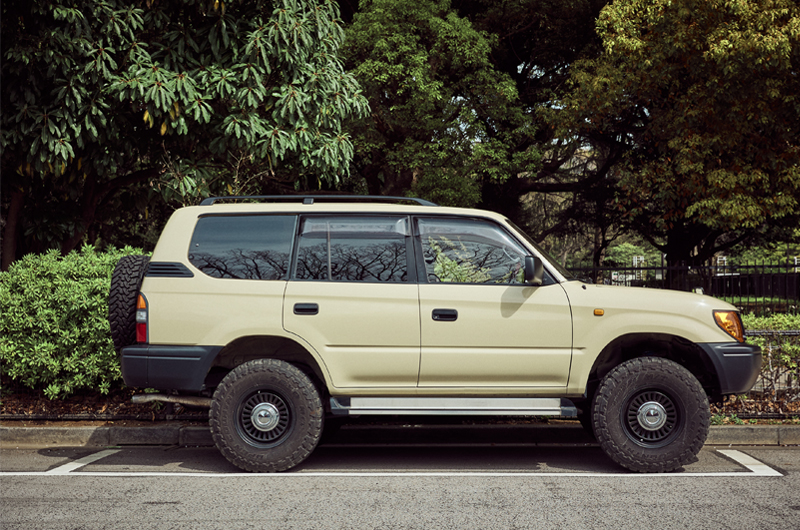 城所さんの愛車は90年代後半にラインナップされていたトヨタのランドクルーザープラド。いわゆる95プラドと呼ばれる車種です。2インチアップされた迫力の見た目はアウトドア感たっぷり。パワフルな四駆ゆえに悪路も苦としない走破性を持ち、一方で小回りが効くため街乗りにも最適な一台として、アウトドアズマンから絶大な人気を誇ります。オールペンされたボディに浮かび上がるレトロなアルファベットロゴがまた、雰囲気抜群!