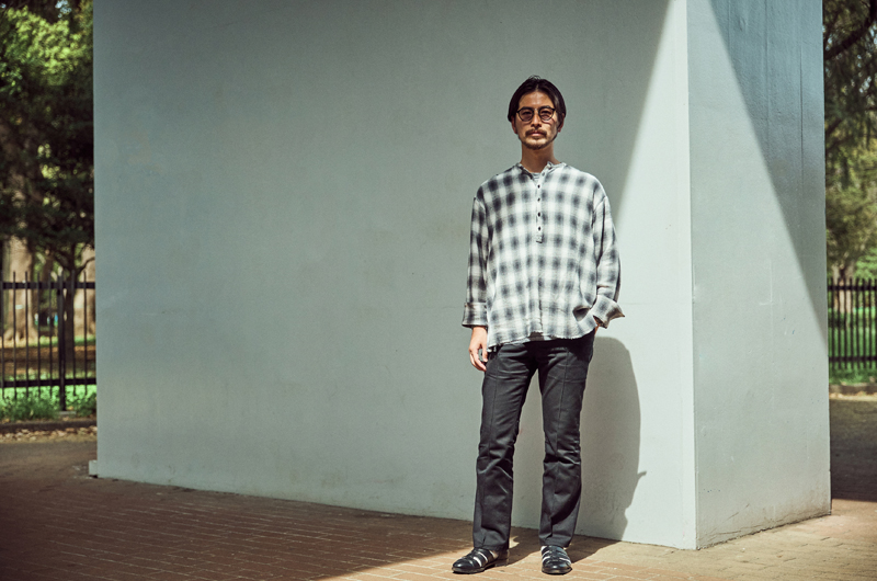 「70’sスタイルが好み」という城所さん。この日はフレアパンツにグルカサンダルとタイダイ柄ソックスを合わせることで、オンブレチェックが非常に引き立っていました。シュッとしたスタイリッシュな印象の出立と無骨なランクルとのミスマッチが、雰囲気をさらに高めていますね!