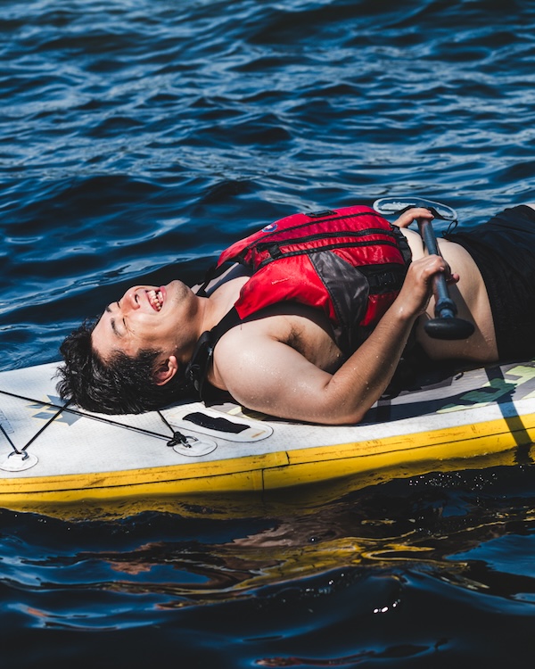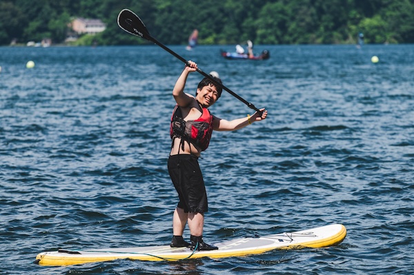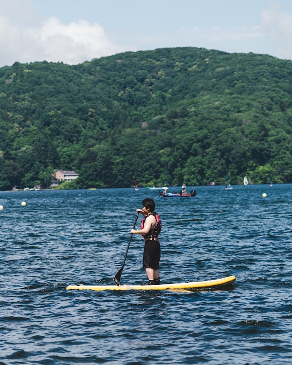 野尻湖のゆったりとした時間が流れる中で、景色を目で楽しみながら、水の音を耳で感じ、ボードを漕ぐ時間は代え難い体験でした。