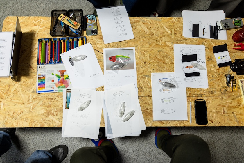 完成までには、フィールドでの実釣テストも欠かせません。実際にルアーを投げては動きを確認し、「この水の色だとどうかな?」「深いのを狙うなら派手な色がいいかな?」と、まさに探りながらの作業。両者の情熱が注ぎ込まれた、まるで生きているかのようなルアーが少しずつ形になっていきました。
