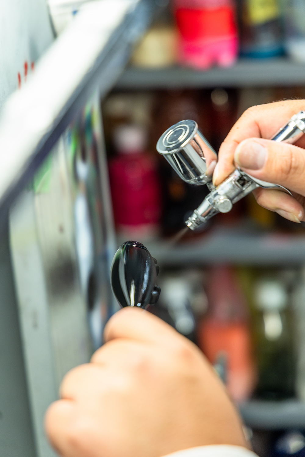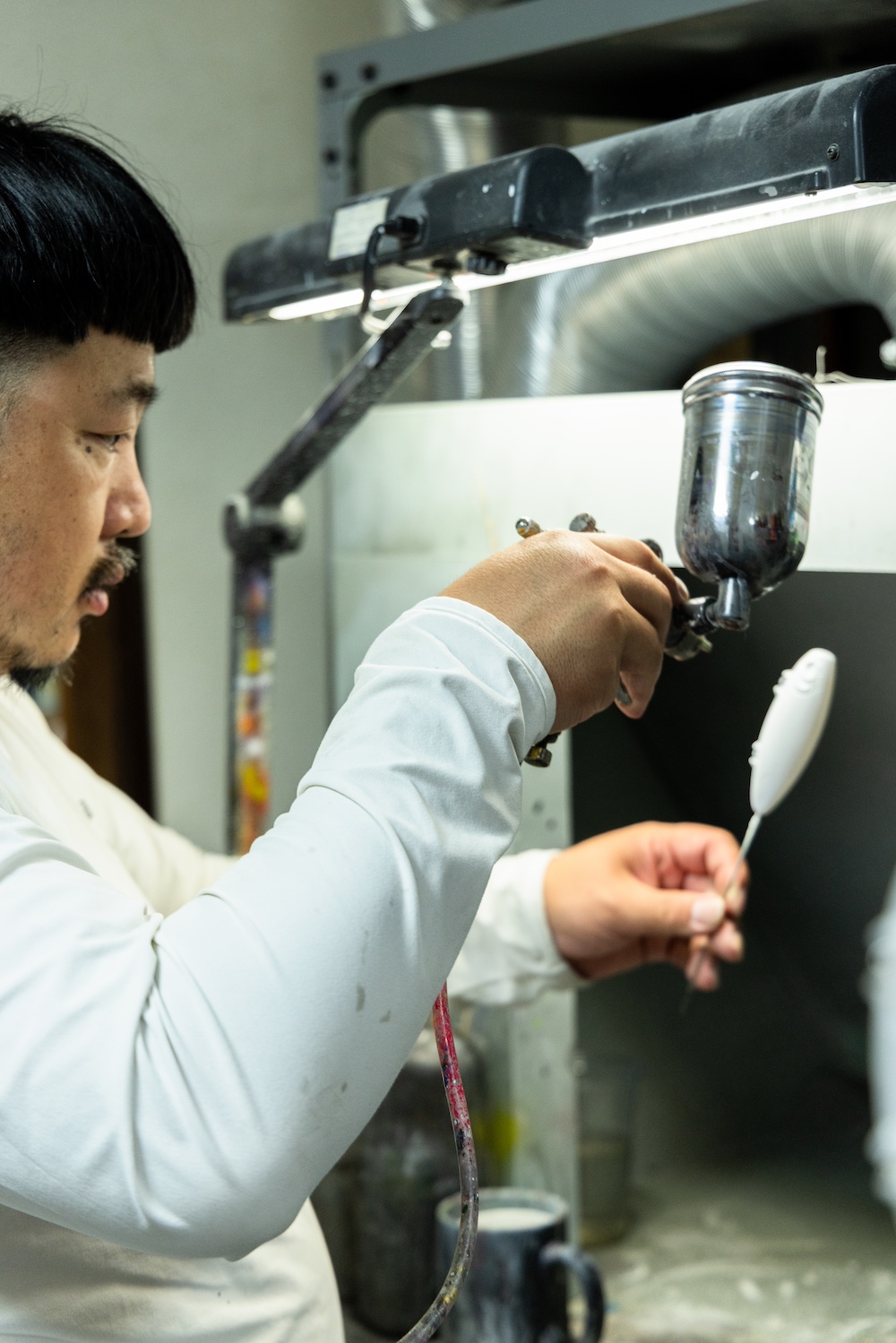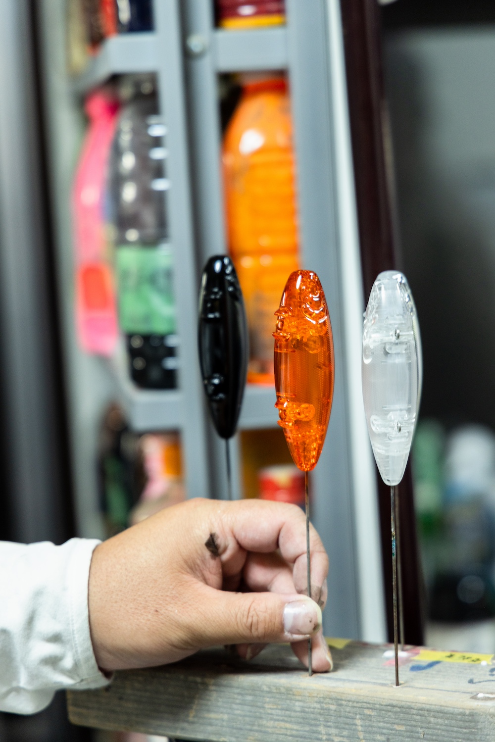 試作段階のルアーは、松本氏の手によって一つ一つ丁寧に削り出され、色付けされていきます。ここにも、使いやすさや釣果へのこだわりが詰まっています。