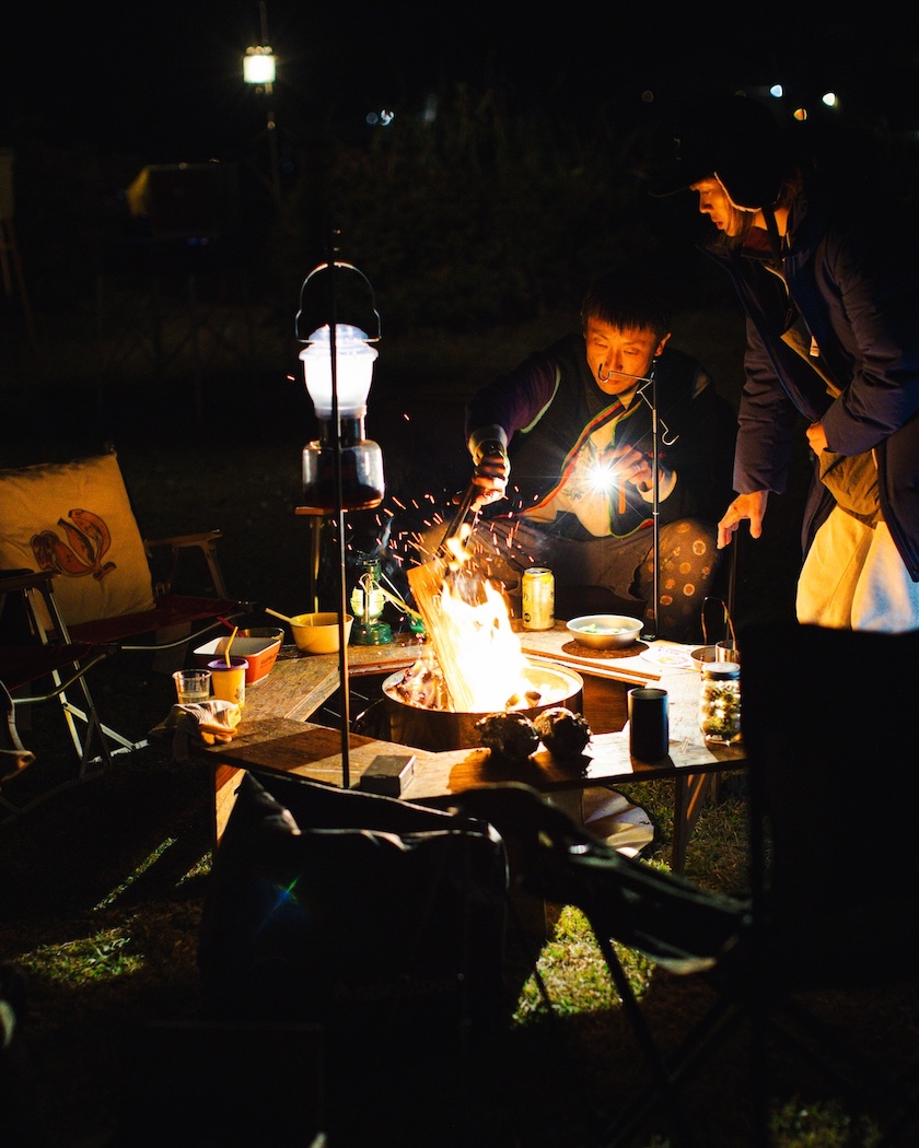焚き火のまわりには自然と人が集まり、対面で距離が縮まる素敵な空間に。