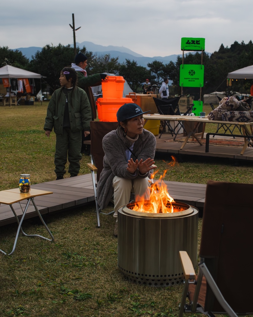 焚き火のまわりには自然と人が集まり、対面で距離が縮まる素敵な空間に。