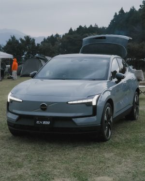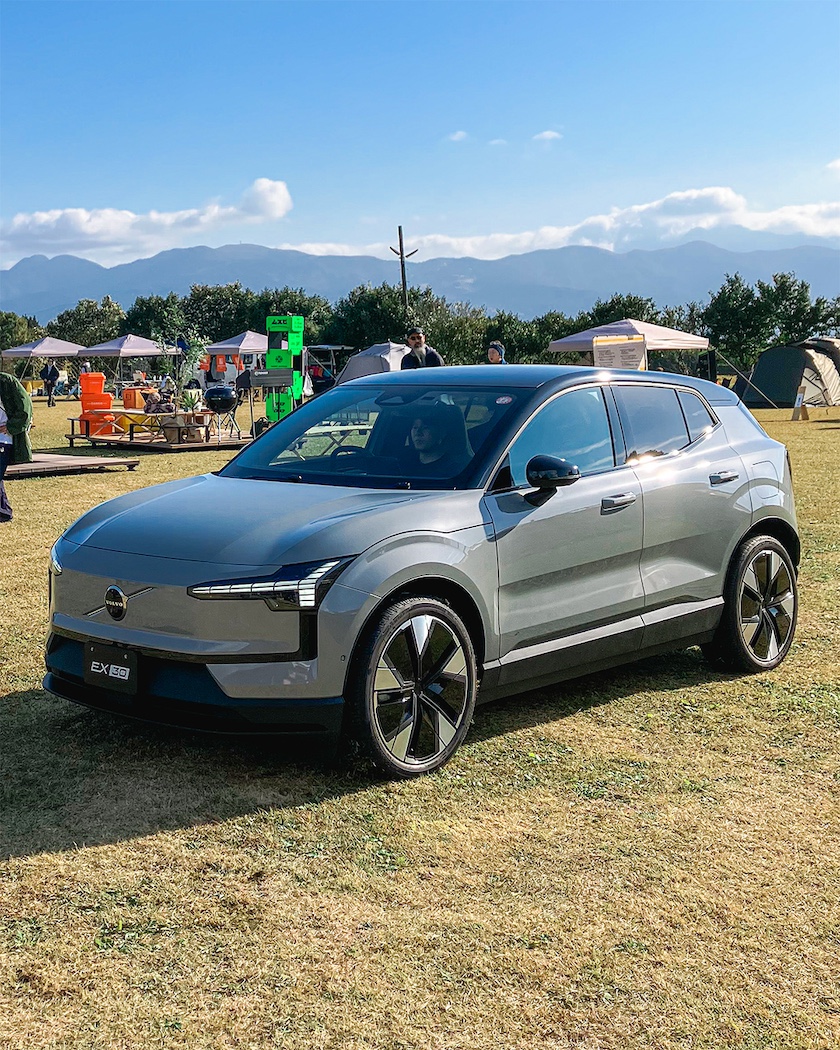 キャンプには珍しい電気自動車の出店は、〈Volvo〉の『EX30』。色合いやフォルムがアウトドア空間にも馴染み、当日に開催されたパズルがプレゼントされるクイズ大会も大いに盛り上がりました。