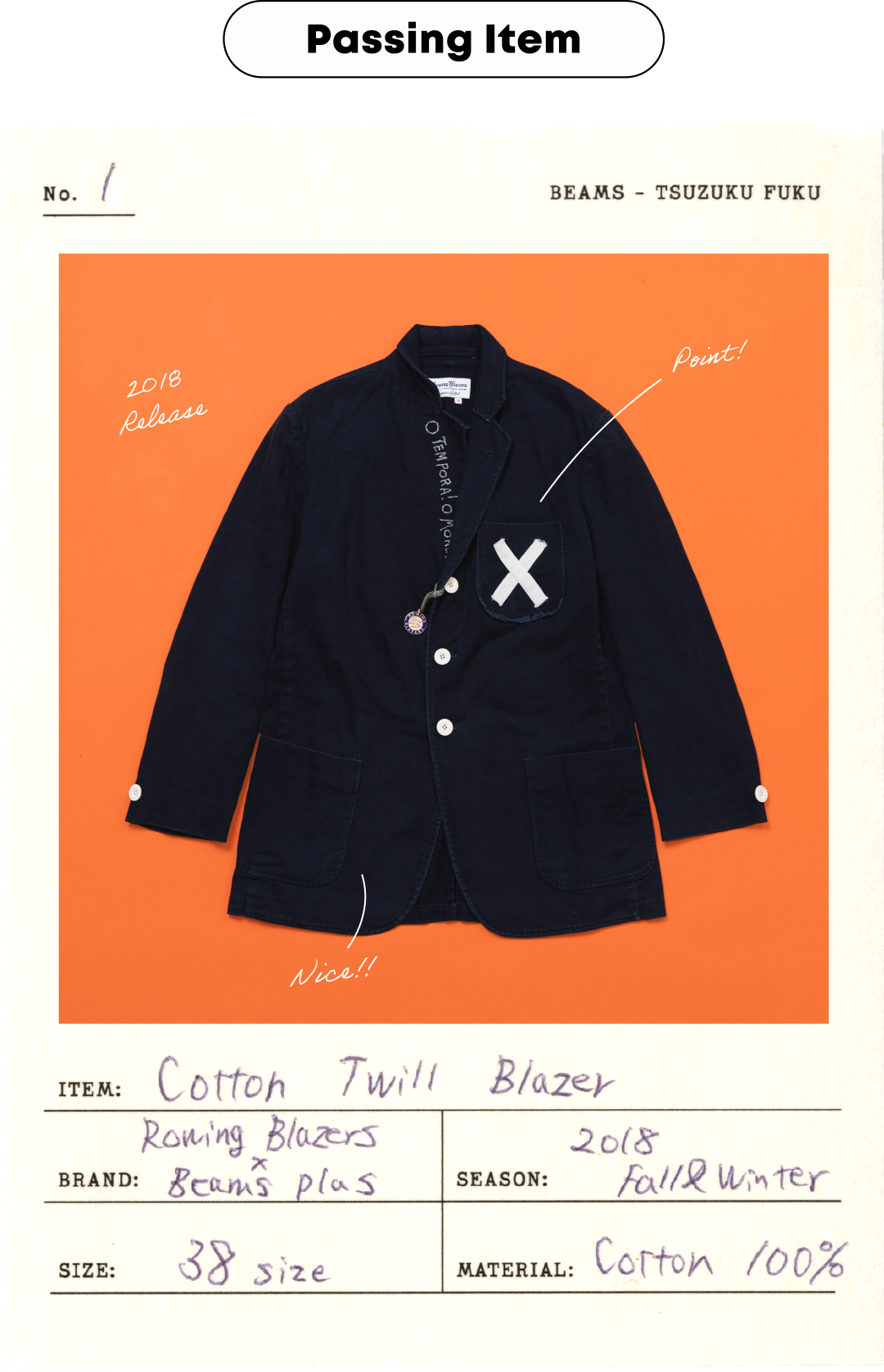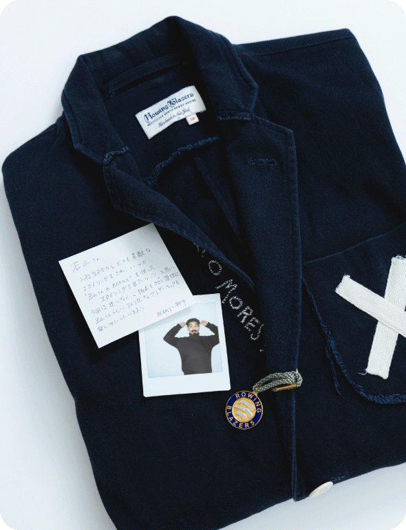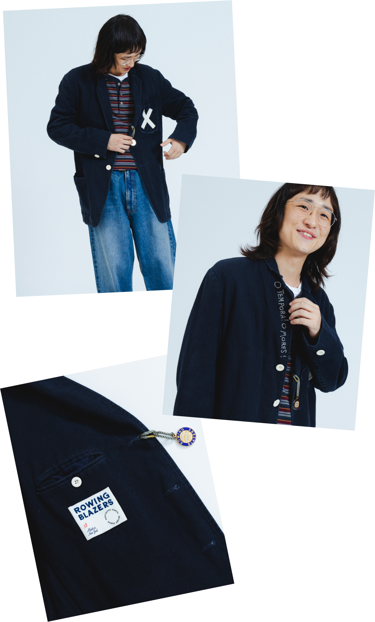 柳井さん(ゆずる人):2018年にリリースされたこのブレザーは、士気を上げるためにチームメイト同士で取っ組み合いをしてから大会に臨むという伝統的な風習を持つ、オランダのボートチームのブレザーがデザインソース。実際のチームのブレザーは皆ボロボロで、リペアされていたり、後輩へ受け継がれて更にボロボロになっていたりするのですが、このブレザーはリペア風のラペル仕様や胸ポケットのパッチ、ラペル裏にハンドステッチ風で記されたことわざなど、ファッションとして昇華されていて、そのディテールに惹かれました。肩肘張らずに着用できるブレザーとして、色々なスタイリングで楽しんだ当時に比べ着用頻度は落ちたものの、まだ現役の一着。アイテムのストーリーのように、クラッシュ&リペアを繰り返し、ゆくゆくは顔が知れる人に譲りたいと思っている、たくさん想いの詰まった一着です。