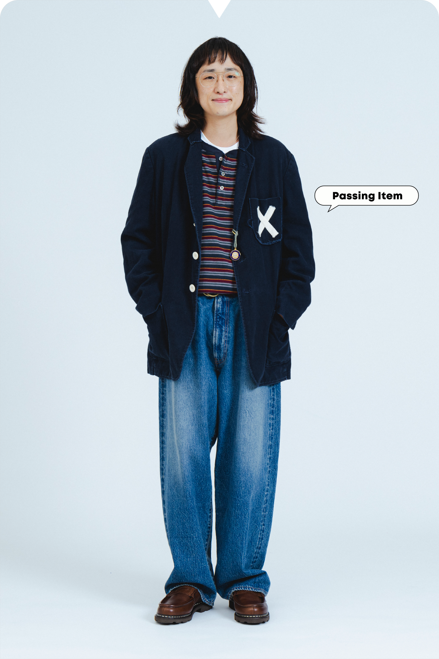 若山さん(もらう人):沢山着込まれているこのアイテムを実際に受け取ってみて、柳井さんが注いできた愛着をひしひしと感じました。私は普段ジャケットを着用する機会が少ないので、心がけたのは、肩肘張って見えない普段通りのスタイリング。最近個人的に注目しているヘンリーネックTシャツや偏愛しているデニムジーンズを合わせてみました。ブレザーのコットンツイルが持つ味のある粗野な雰囲気が、私のスタイリングを格上げしてくれている気がしています。