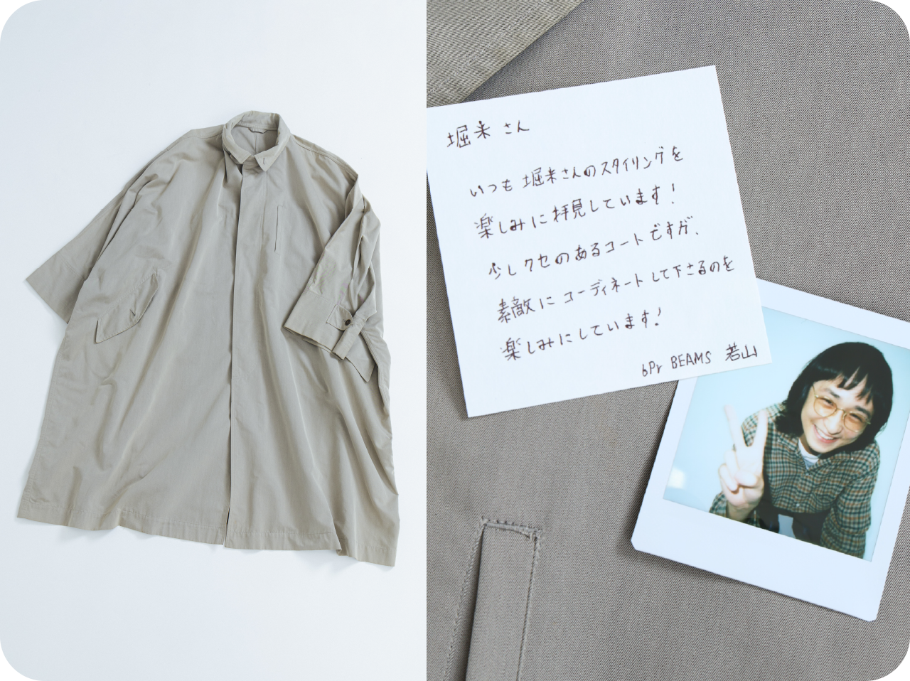 学生時代に強く魅了され、20代に衝動買いしたブランドのコート。でも、デザインの強さに自分が負けてしまってまだ着こなせず…。いつか自然と似合う人になれるよう年を重ねていきたいので、今回は、どんな服も自分らしく馴染ませる「ビームス ウィメン 原宿」の堀籠さんへ。素敵な大人のスタイリングが楽しみです!